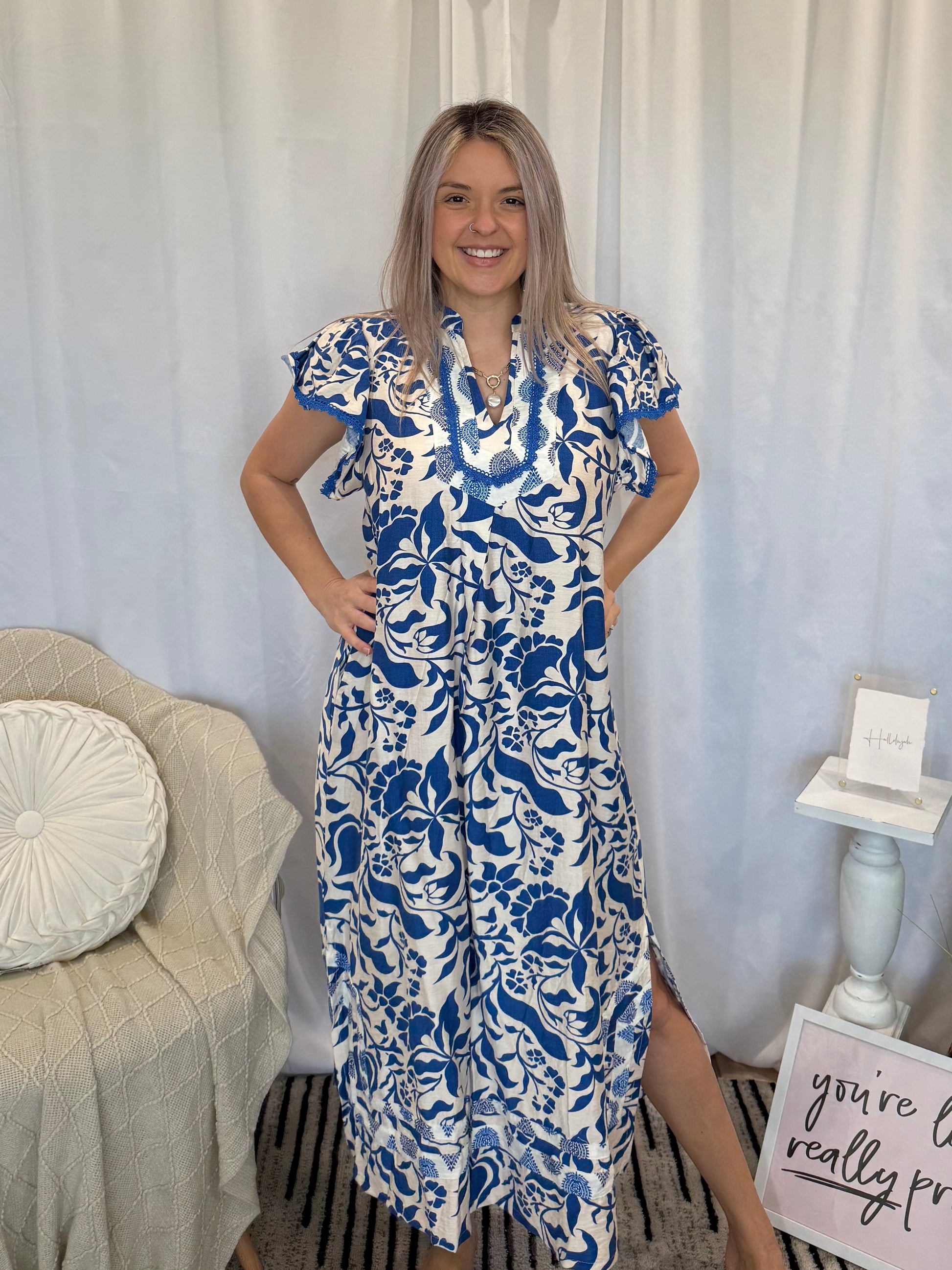 Blue and brown patterned dress with pockets. Runs true to size