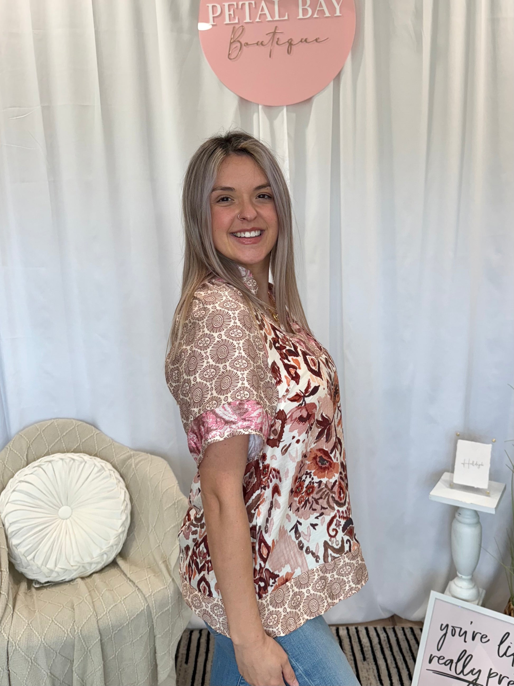 Blush patterned top. Runs true to size