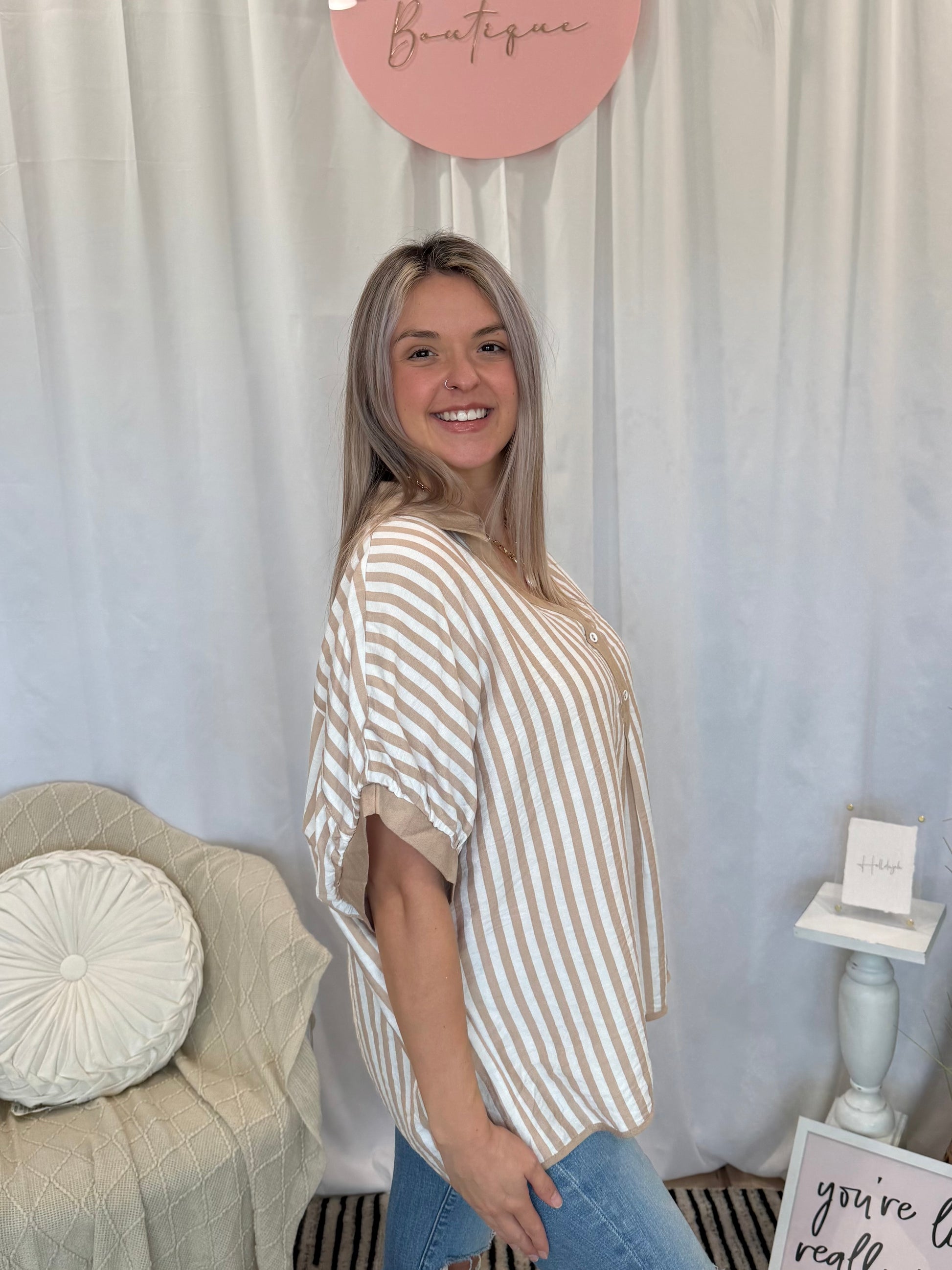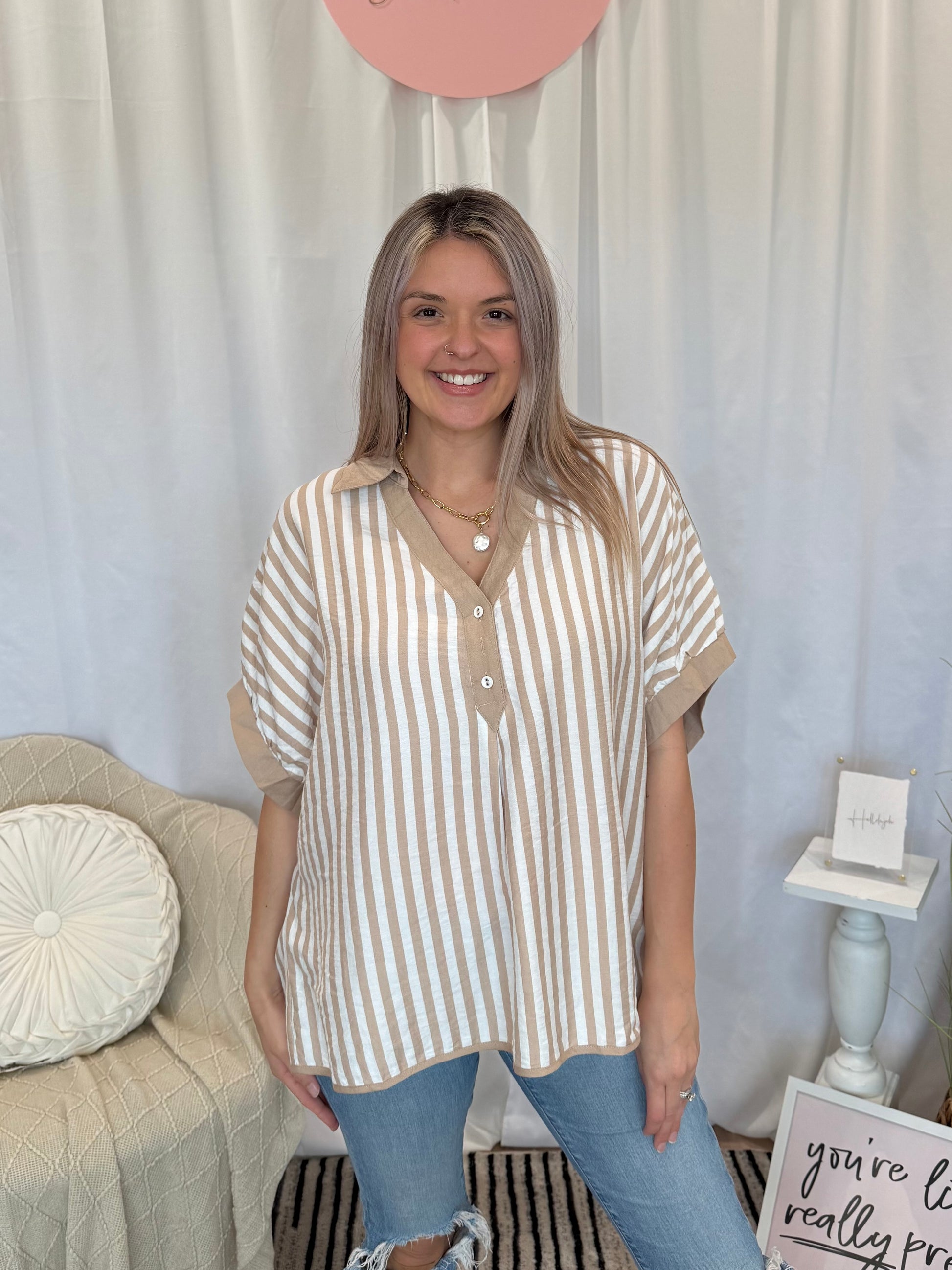 Tan and white top. Fits over sized