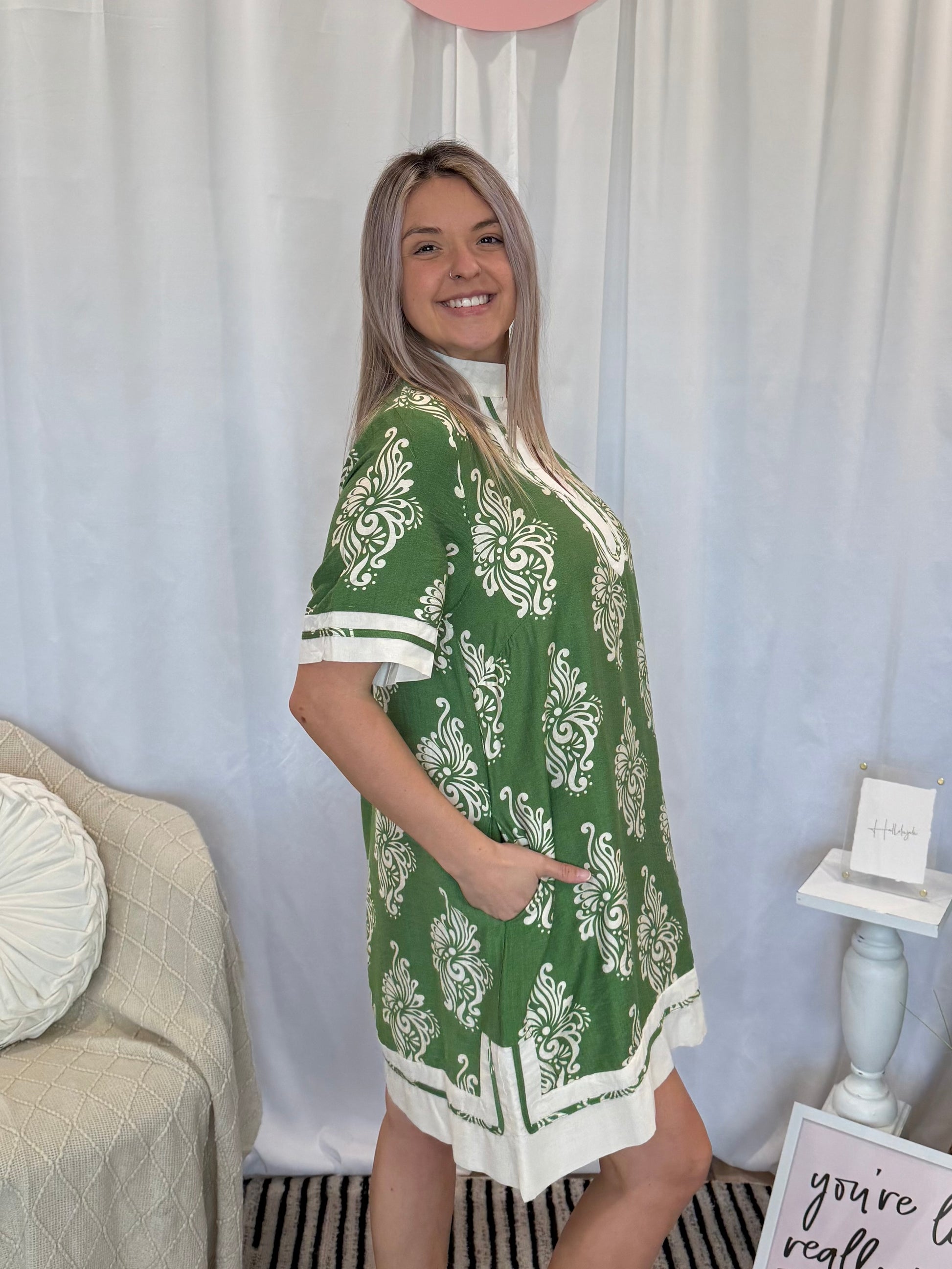 Green and white patterned dress with pockets. Runs true to size